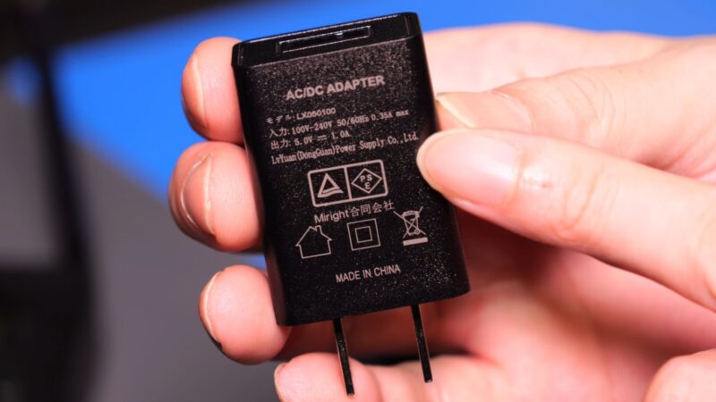 ACアダプターは5V1A。PSEマークと輸入事業者名らしきものはありますが、正直かなり安っぽい。燃えたら怖いので別の電源を使うことにします。