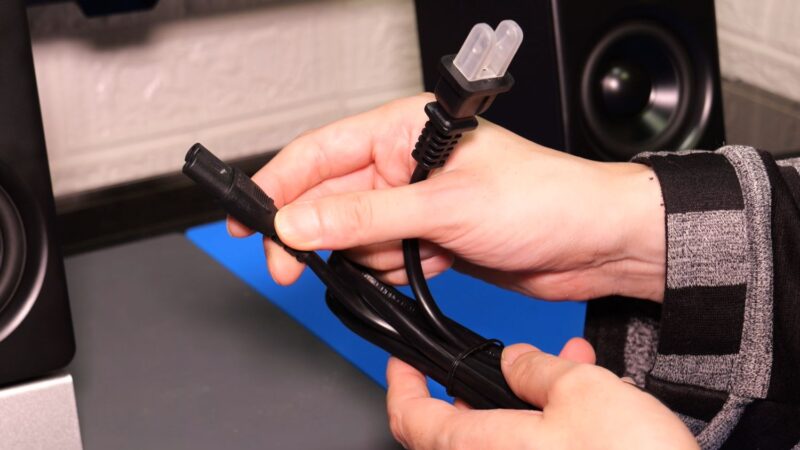 両端3.5mmケーブル、電源ケーブル(いわゆるメガネケーブル)、左右接続用の専用ケーブルが付属します。