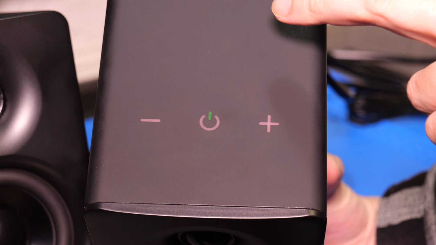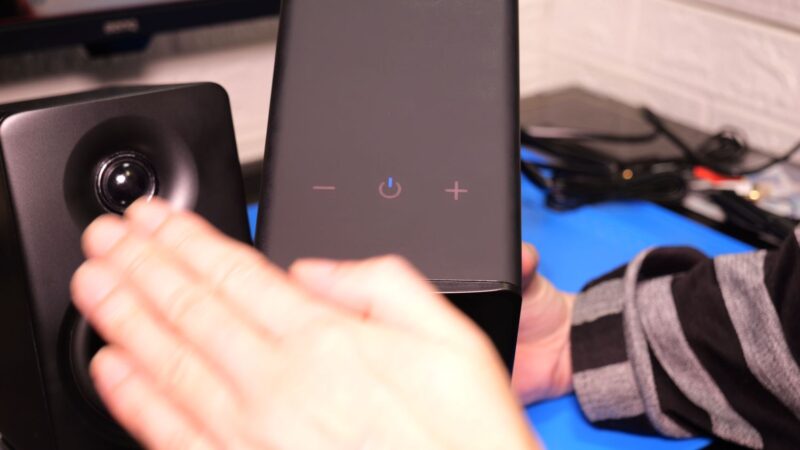 左右のスピーカーを接続して電源を入れると、上部が光り始めました。