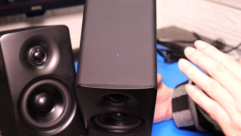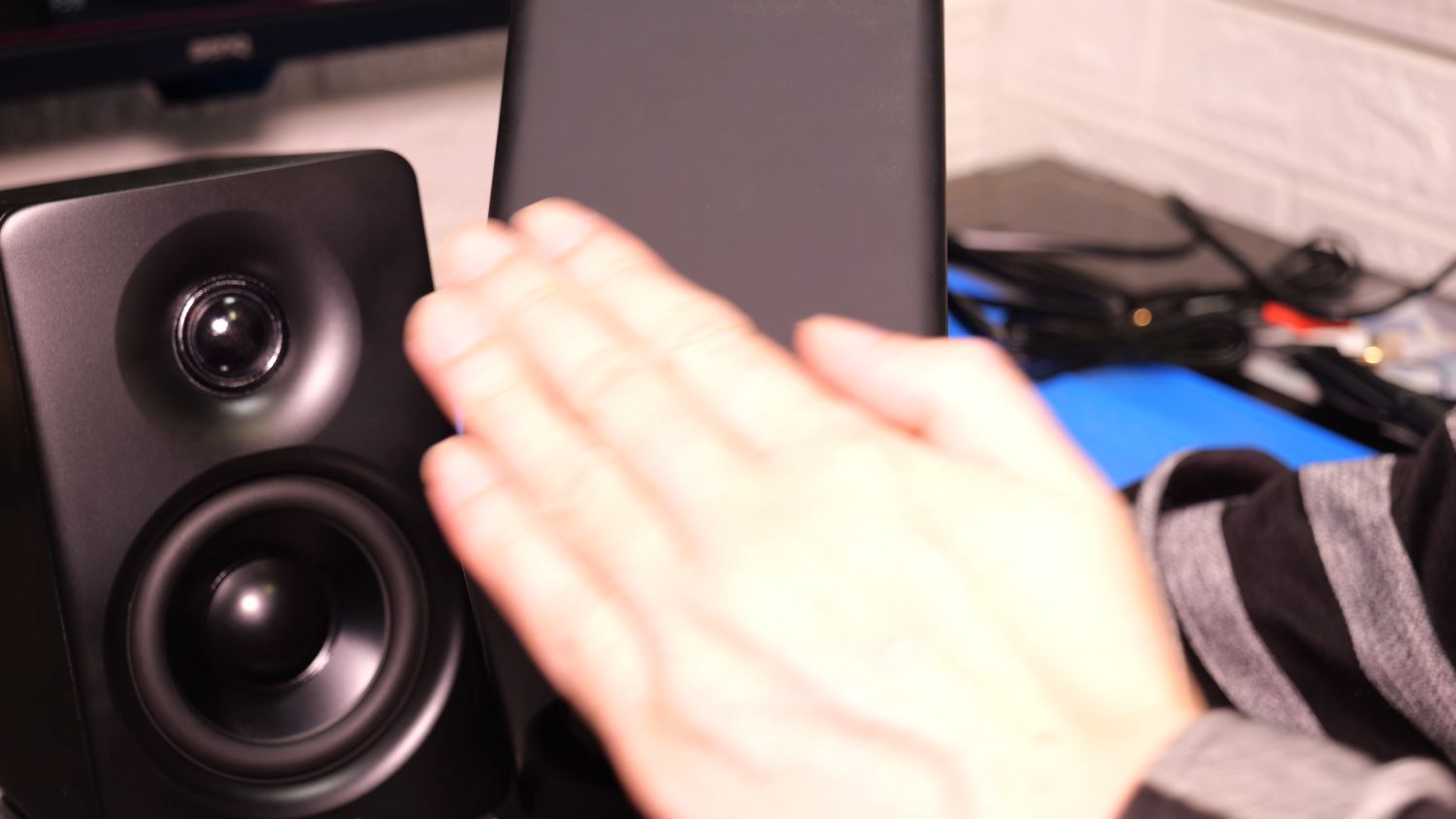 パソコンの左右に置く前提なので、耳に音が向くように角度が付くのは理にかなっています。