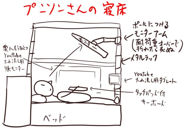 自分の寝床を横から見ると、メタルラックのポールにモニターアームを取り付け、仰向けで画面を見るという異常な構成になっています。