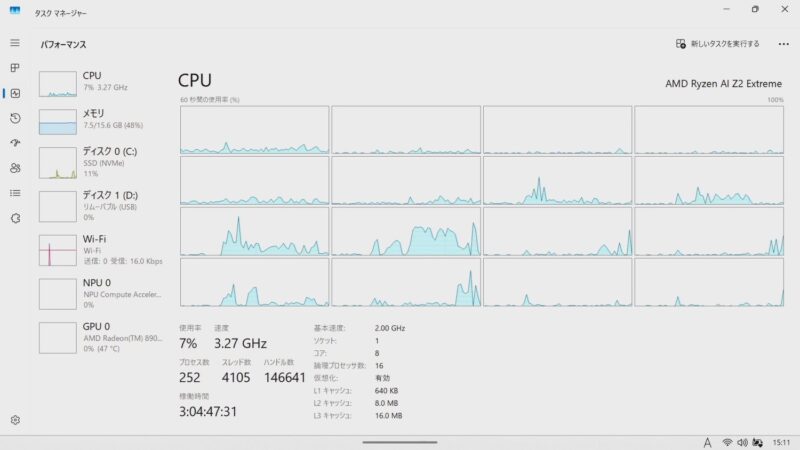 今回はAI対応なのでNPUのタブがありますが今回は割愛します。