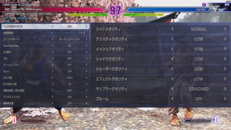 結構重たいゲームなので内部解像度を最大にしてその他は極力下げた設定にします。