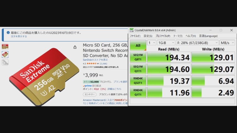 今回はDDR200対応ということでサンディスクのDDR200対応カードを使ってみたところ200MB/sというそれっぽい数値が出ました。