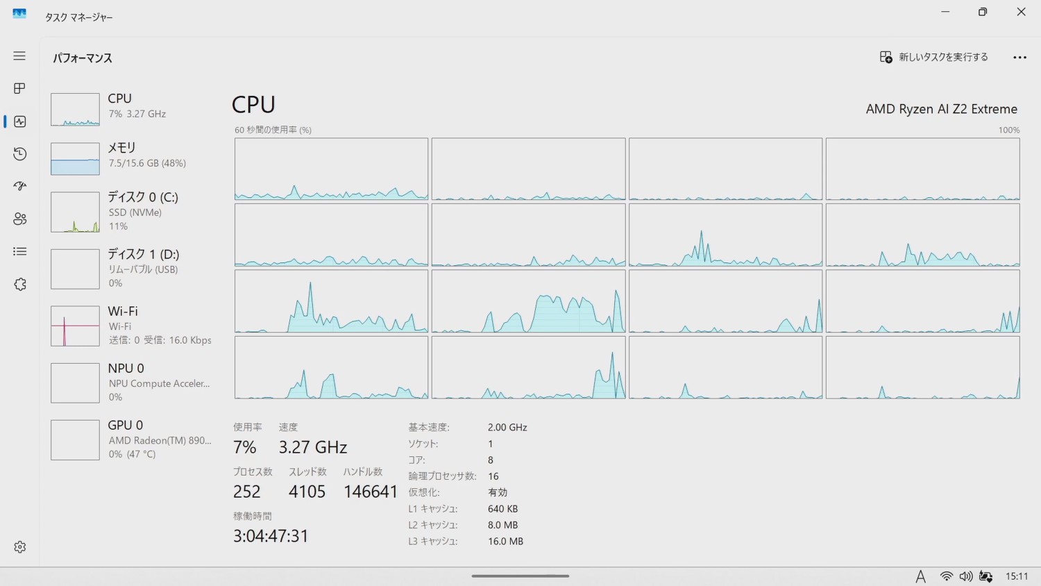 CPUは8コア16スレッド